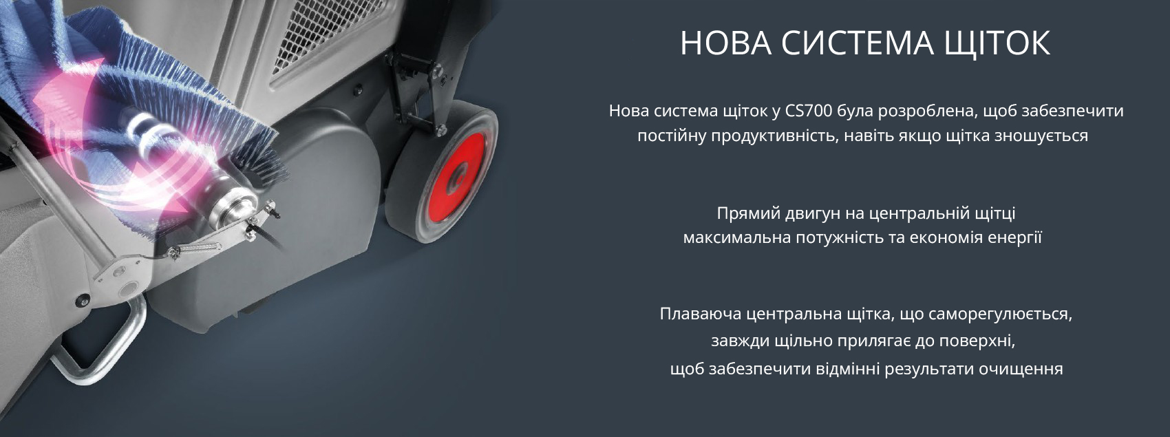 Серія CS700 доступна в модифікації з живленням від батарей або бензиновим двигуном і з двома варіантами робочої ширини для задоволення будь-яких потреб у сфері прибирання. Збиральна машина від Comac винятково ефективна навіть при роботі з грубим сміттям та підходить для очищення внутрішніх та зовнішніх просторів виробничих приміщень, складів, торгових об'єктів, парковок, будівель громадського призначення, підприємств автомобільної промисловості та транспортної галузі.