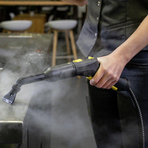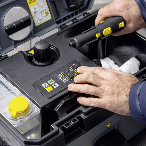 Дуже компактний та зручний в експлуатації: пароочисник Керхер SG 4/2 Classic з унікальною конструкцією "все в одному боксі" та функцією VapoHydro, призначений для очищення та дезінфікуючої обробки без застосування миючих засобів