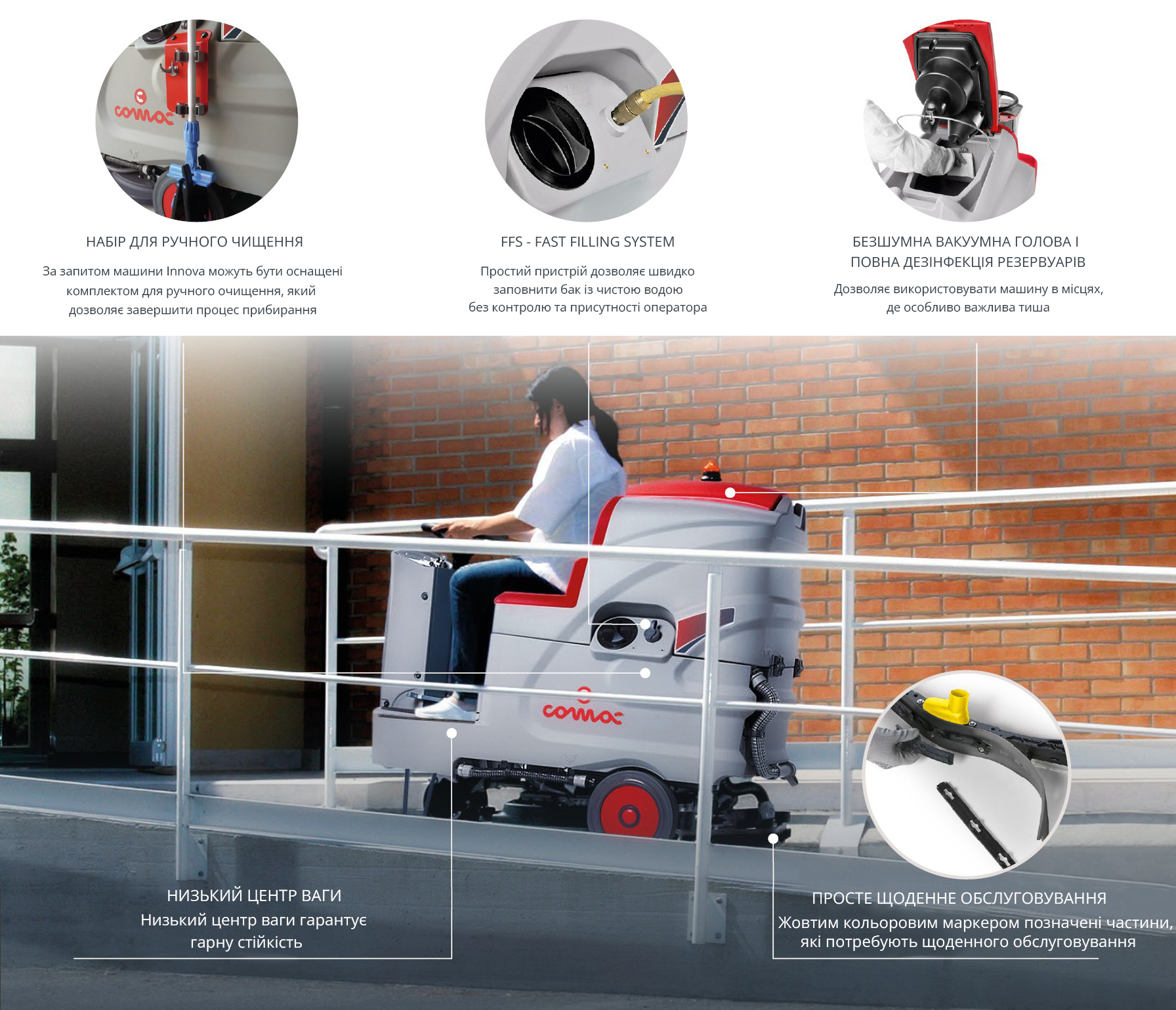 Серія підлогомийних машин Innova набула своєї популярності і завжди високо цінувалася споживачами завдяки надійності та високій продуктивності при митті та сушіння підлог. Серійне оснащення моделей з автоматичним керуванням Innova включає режим Eco, який забезпечує низький рівень шуму і робить ці машини ідеальними для щоденного використання, у тому числі в спеціалізованих установах. Завдяки цим характеристикам їх особливо рекомендують використовувати у таких приміщеннях, як супермаркети, торгові центри, лікарні, будинки для літніх людей, аеропорти та вокзали, а також у виробничих цехах промислових підприємств та на складах.